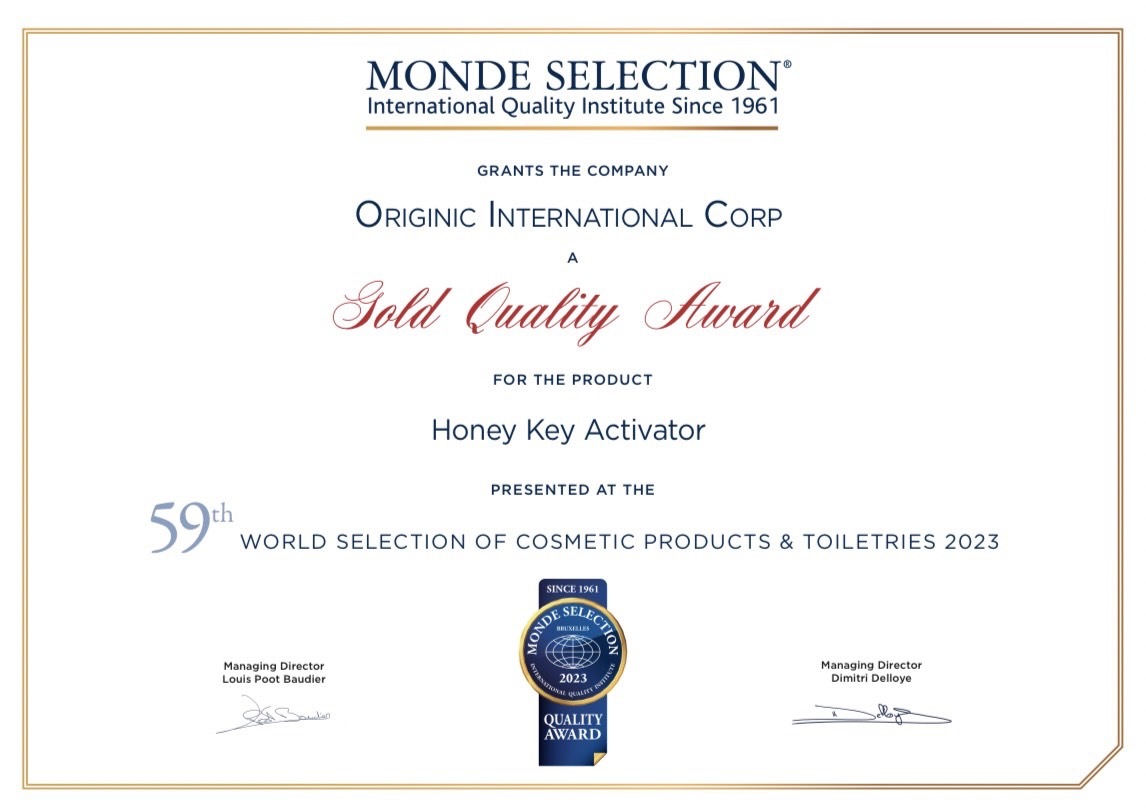由 Monde Selection 世界品質評鑑大賞委任的專家評審團按照依據嚴格標準制定的嚴苛評核流程對 Honey Key Activator 進行了評量和詳細審查。評審團由該領域的獨立國際專家組成,例如大學講師、化學工程師和美妝保養品專家。產品評鑑過程與專家評審團經過驗證的專業知識相結合,肯定了本獎項的價值。